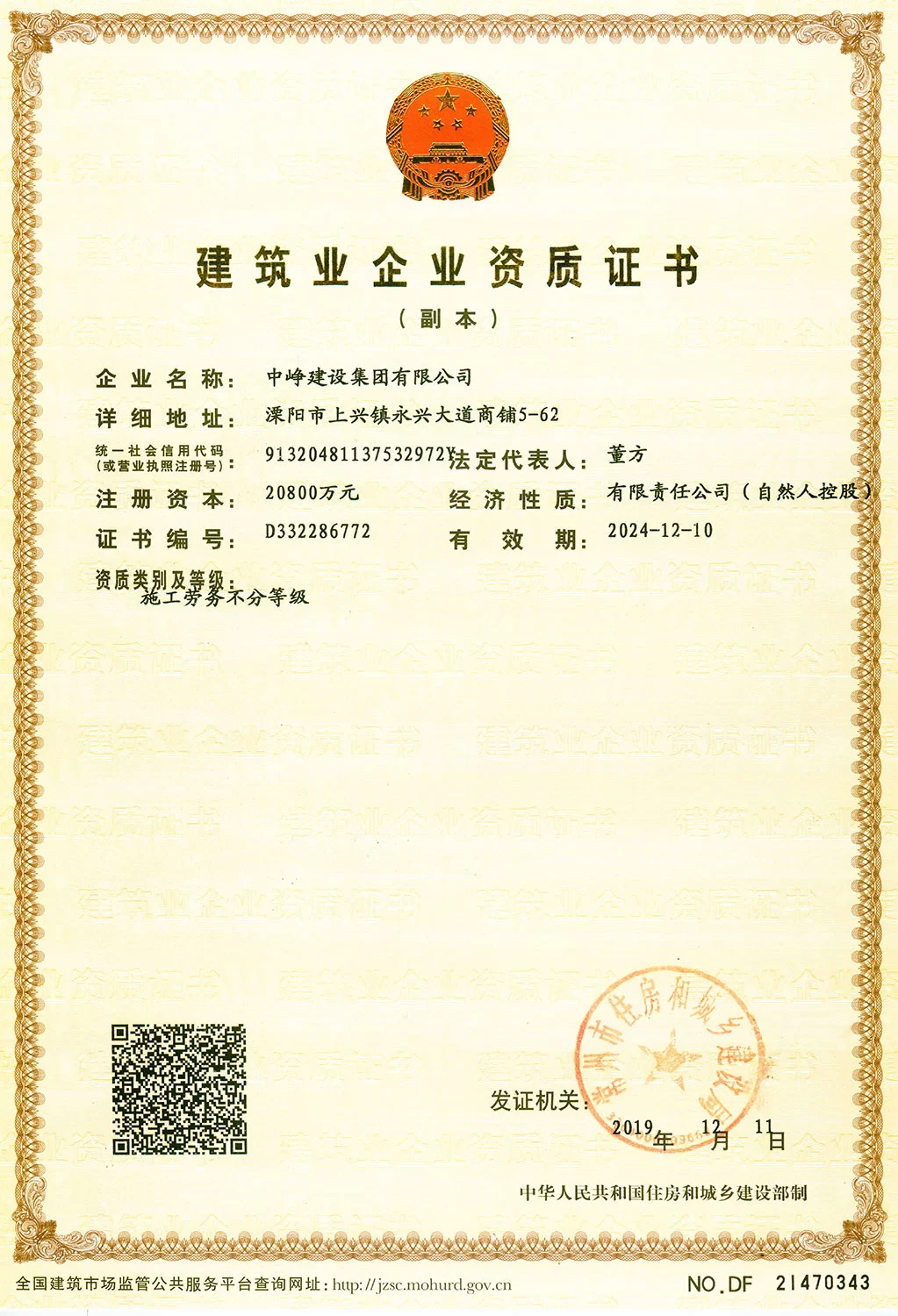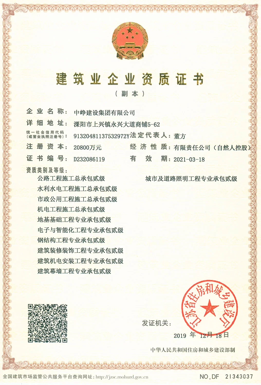 公司現有建筑工程施工總承包壹級資質、公路施工總承包貳級,水利水電工程施工總承包貳級、市政公用工程施工總承包貳級、機電工程施工總承包貳級、地基基礎工程專業(yè)承包貳級、電子與智能化工程專業(yè)承包貳級、鋼結構工程專業(yè)承包貳級、建筑裝修裝飾工程專業(yè)承包貳級、建筑機電安裝工程專業(yè)承包貳級、建筑幕墻工程專業(yè)承包貳級資質、城市及道路照明工程專業(yè)承包貳級,施工勞務資質。公司質量管理規(guī)范、安全管理嚴格、技術管理先進、客戶服務到位,通過近幾年創(chuàng)業(yè)績、創(chuàng)品牌的積累,與“江蘇新世紀控股集團有限公司”等一眾投資企業(yè)建立戰(zhàn)略合作關系,陸續(xù)在華東、華南、西北等地區(qū)開展業(yè)務,開拓省外市場。